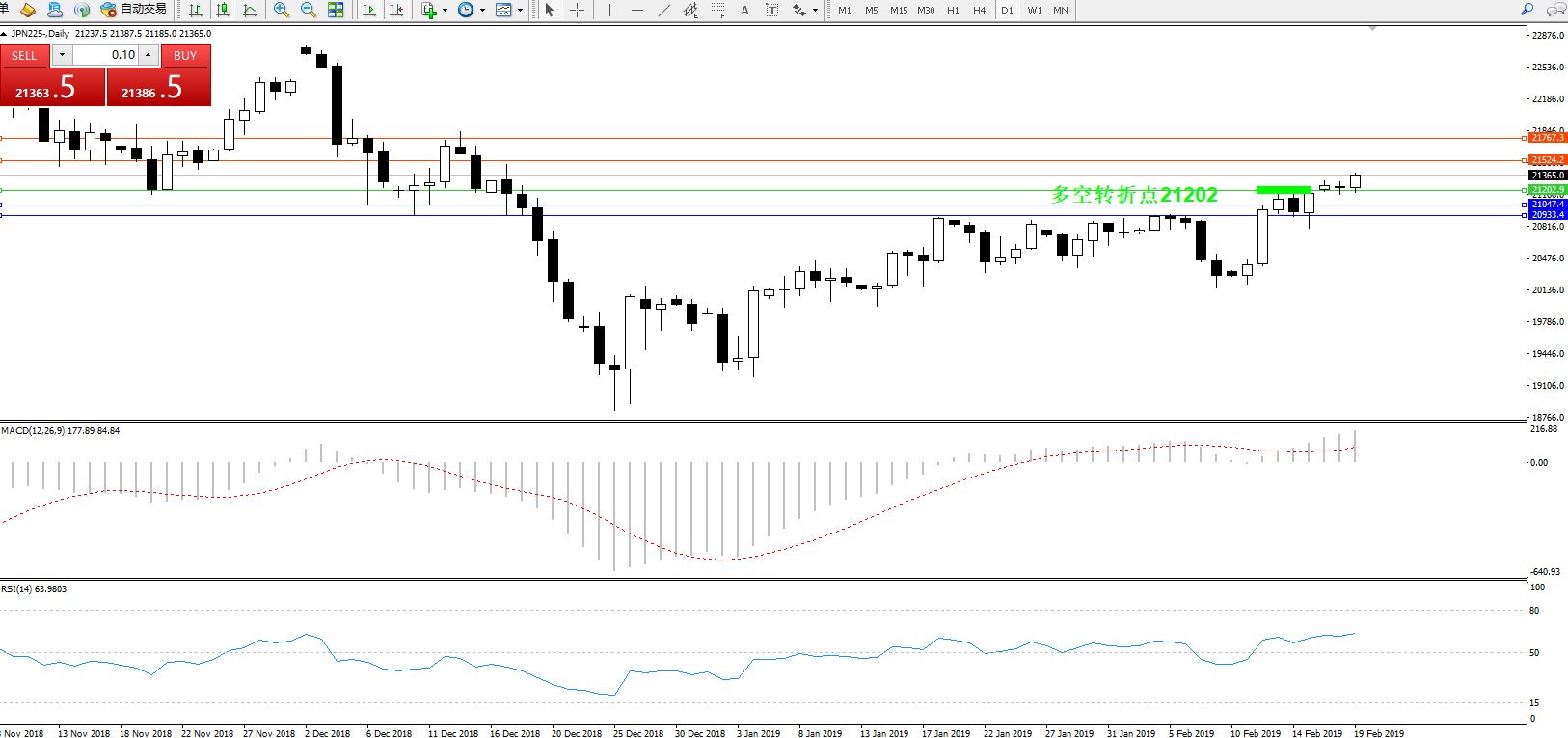 日本股市在星期二收高,其中化工、石油和塑料、天然气和水和铁路和客车等上涨的板块带领股指走高。日经225指数小幅上涨0.1%,收于21,302.65点,涨至两个月高点,大盘涨势受防御型股票引领,因各界期待美国和中国贸易谈判有所突破,然而在全球经济放缓疑虑挥之不去之际,投资者态度转向谨慎。