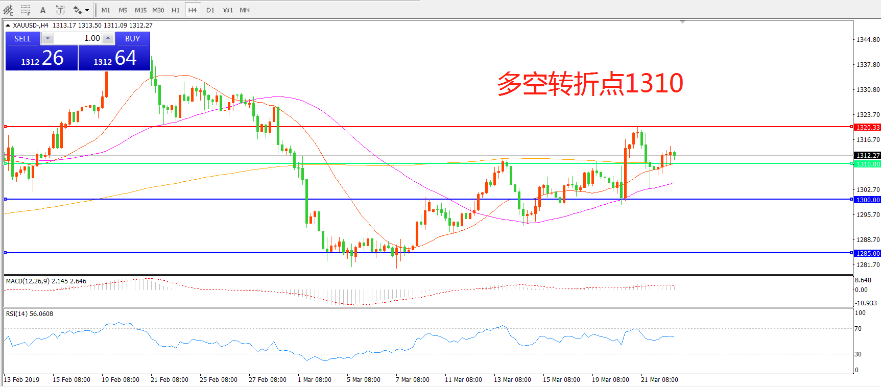 交易策略:在1310.00之上看涨,目标1320.00  1330.00