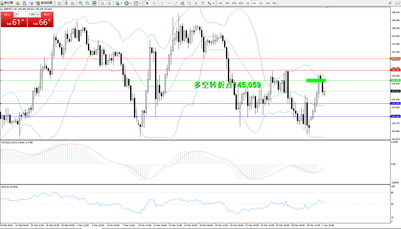 备选策略:145.059上方看涨,目标146.491、146.972