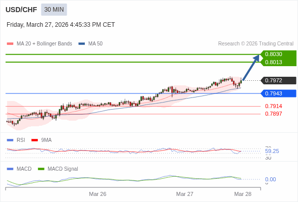 美元/瑞郎 当日内 : 看涨,当 0.7943 为支撑位,目标定在0.8030。