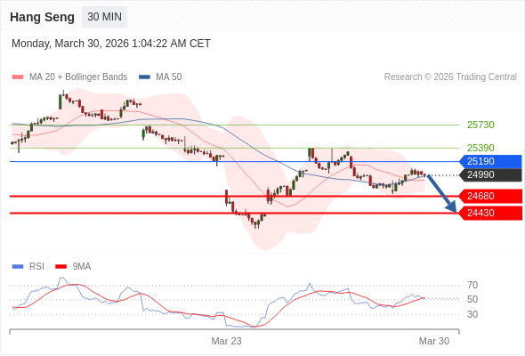 恒生指数 当日内: 短期关键阻力位在25190。
