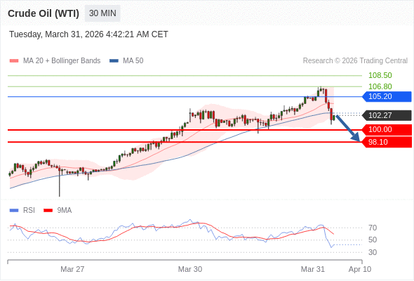 在 105.20 之下,看跌,目标价位为 100.00 ,然后为 98.10 。
