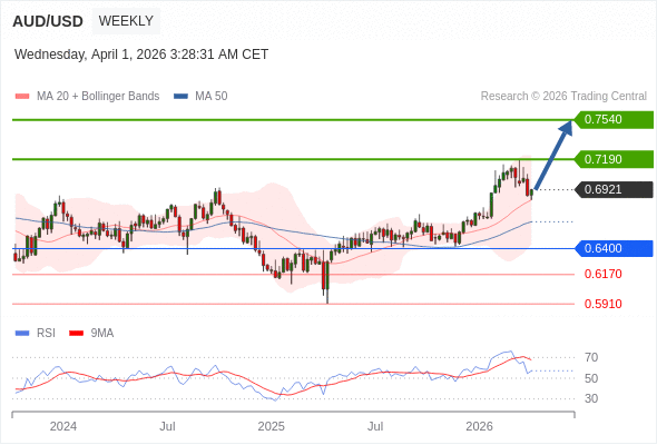 在 0.6400 之上,看涨,目标价位为 0.7190 ,然后为 0.7540 。