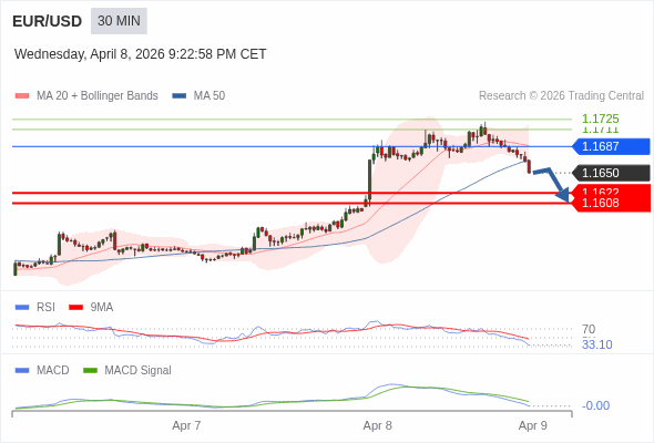 欧元/美元 当日内 : 看跌,在 1.1687 之下。