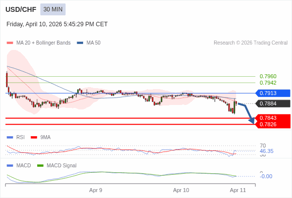 美元/瑞郎 当日内 : 看跌,在 0.7913 之下。
