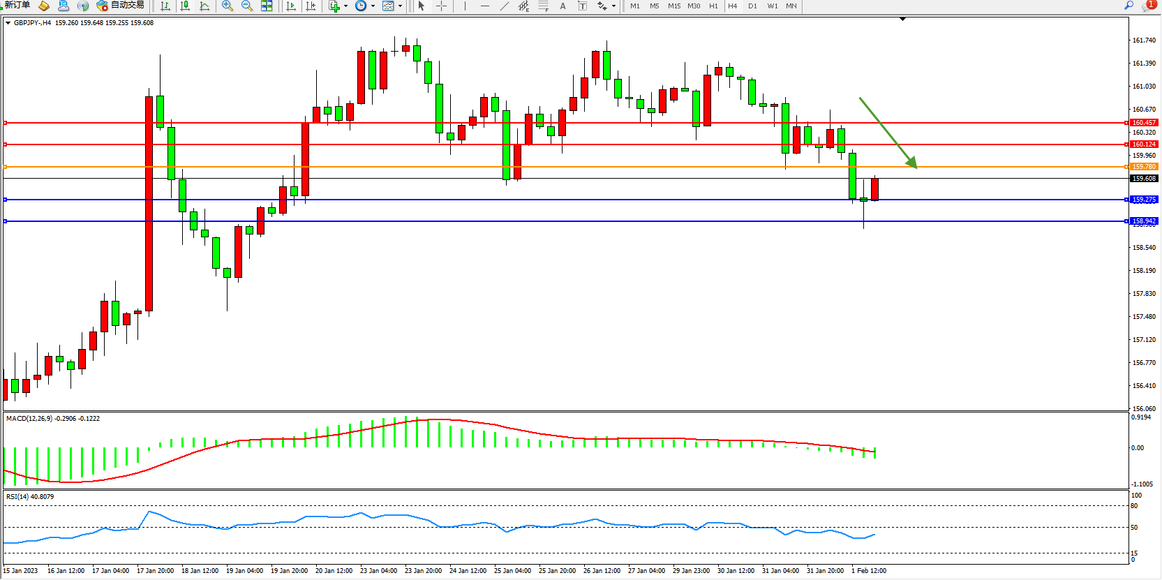 交易策略:159.780下方看跌,目标159.275、158.942