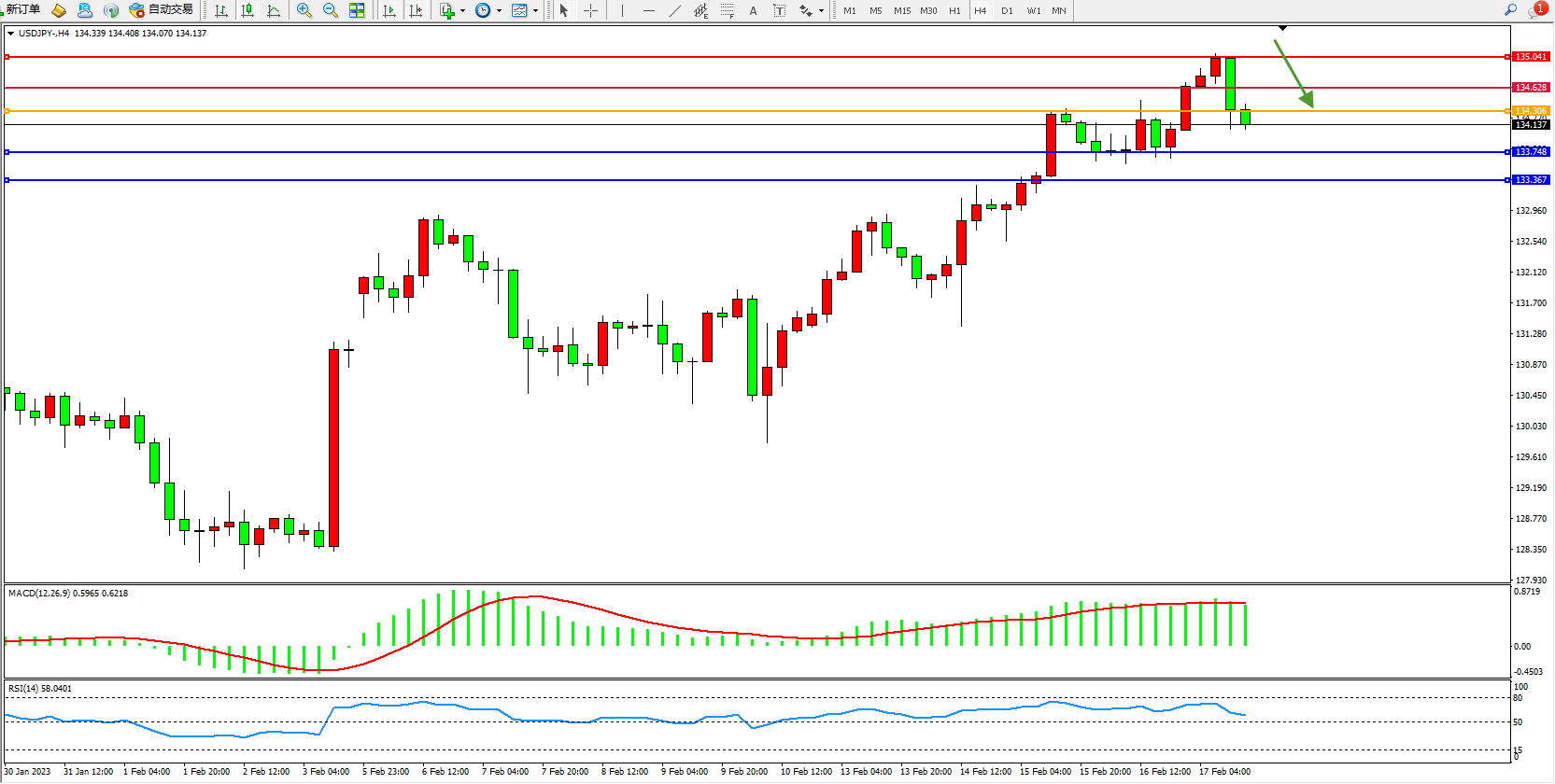 交易策略:134.306下方看跌,目标133.748、133.367