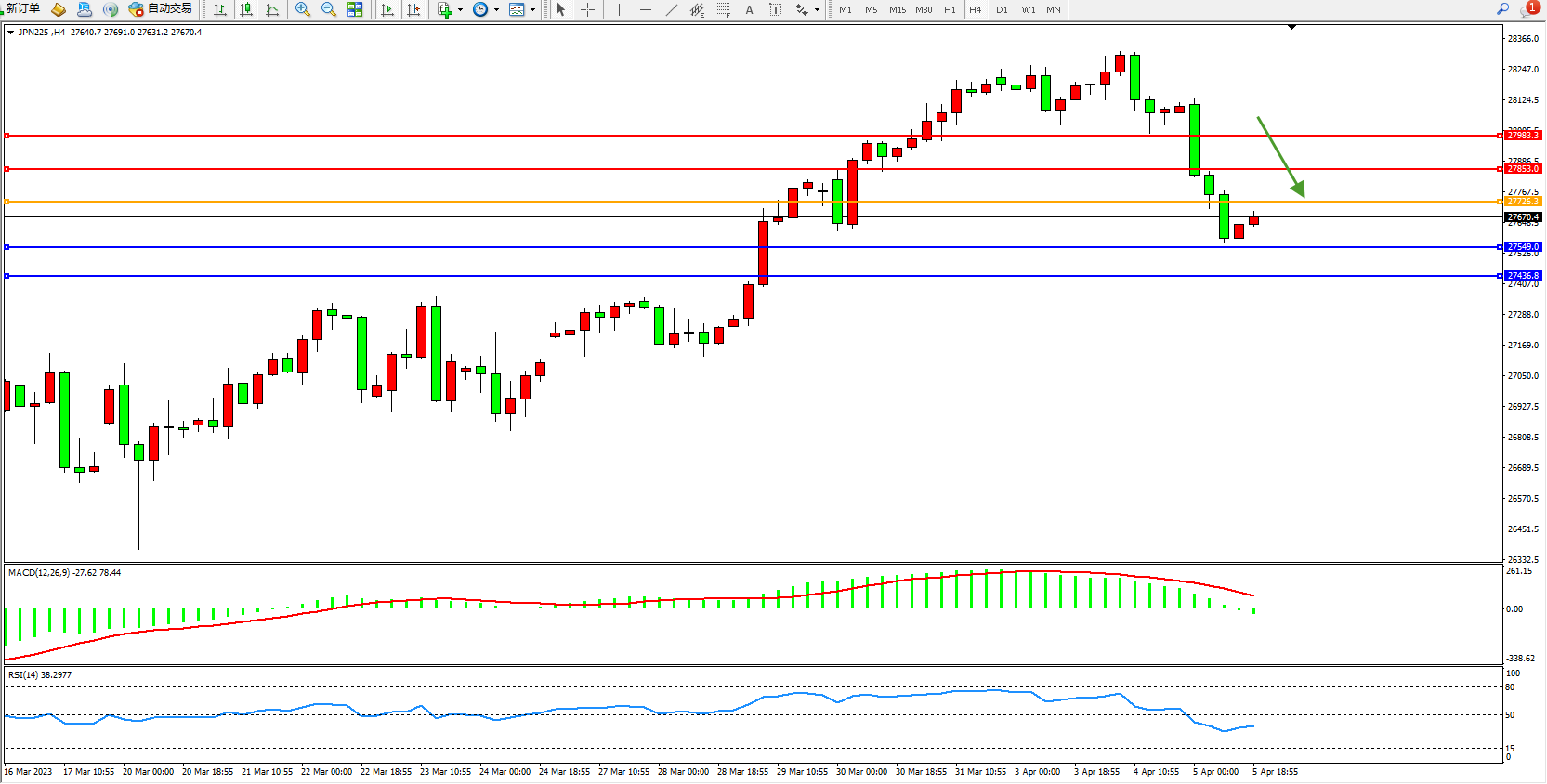 日经指数JPN225——4小时K线图显示: