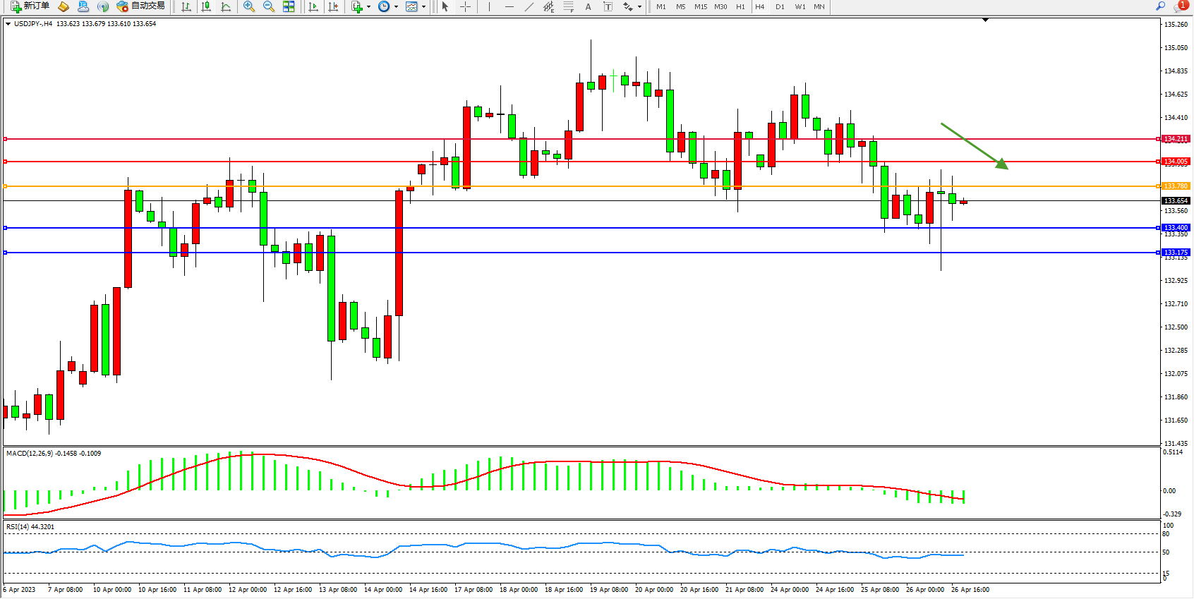 交易策略:133.780下方看跌,目标133.400  133.175