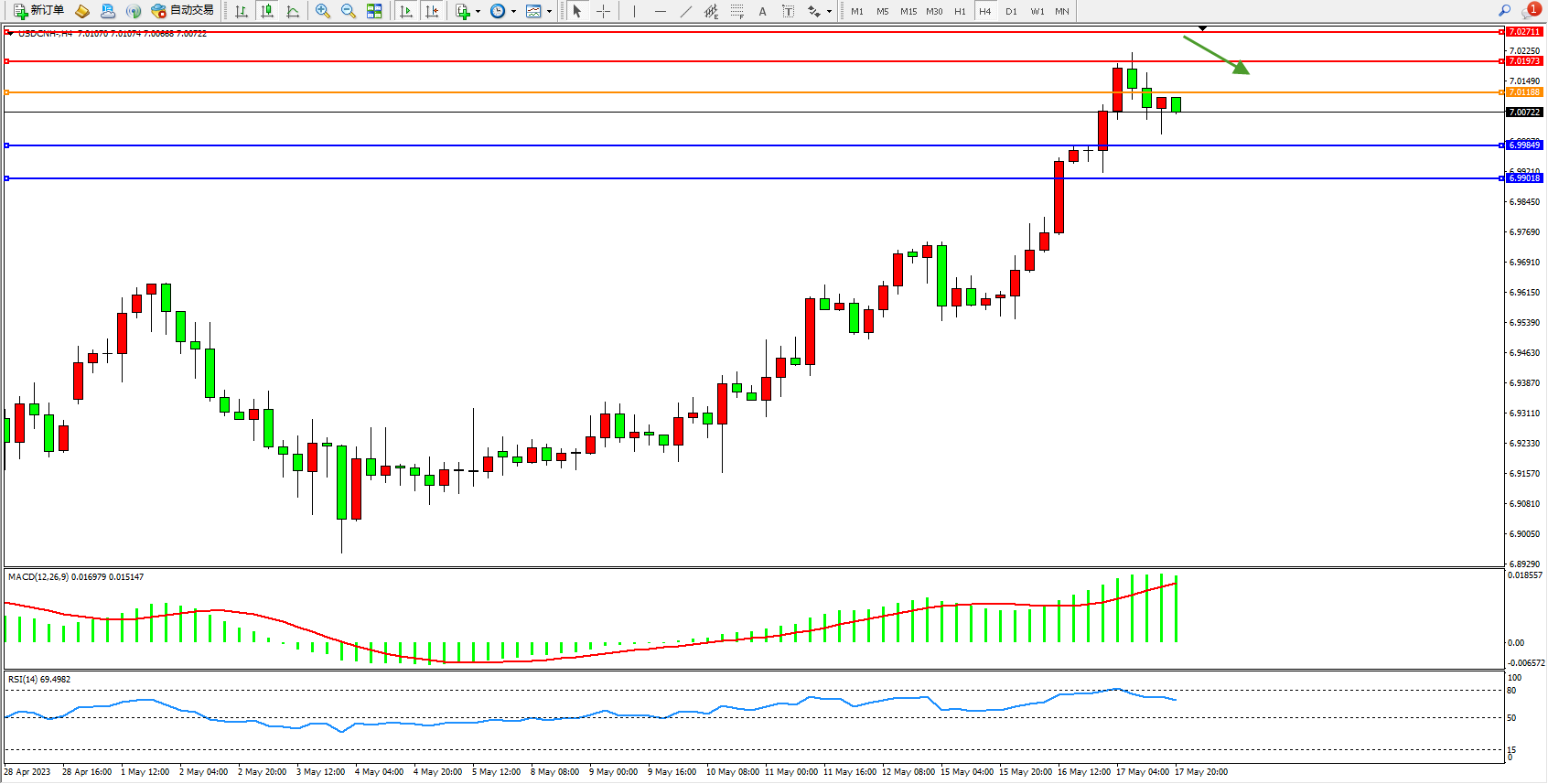 交易策略:7.01188下方看跌,目标6.99849 6.99018