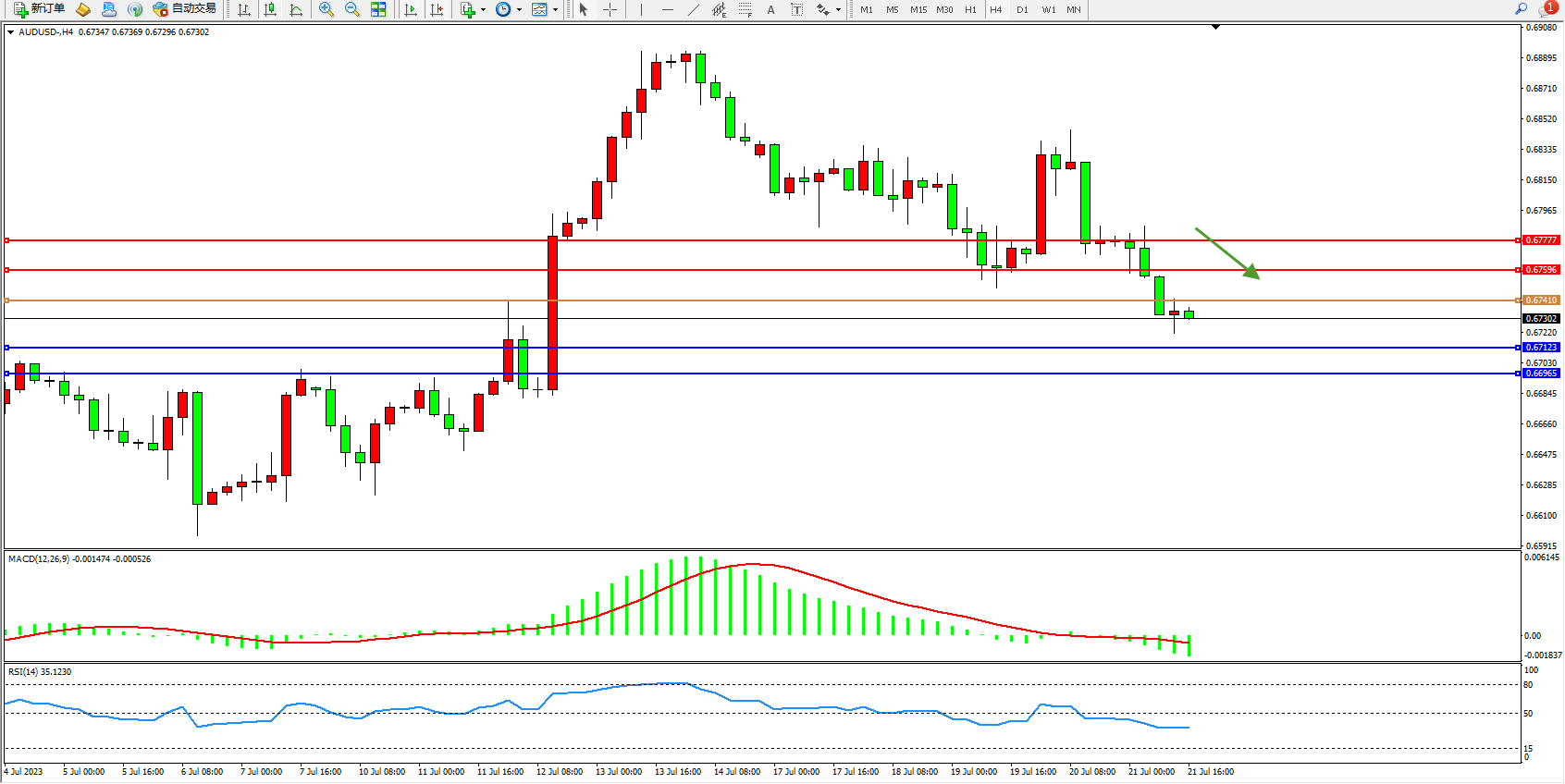 交易策略:0.67410下方看跌,目标0.67123 0.66965