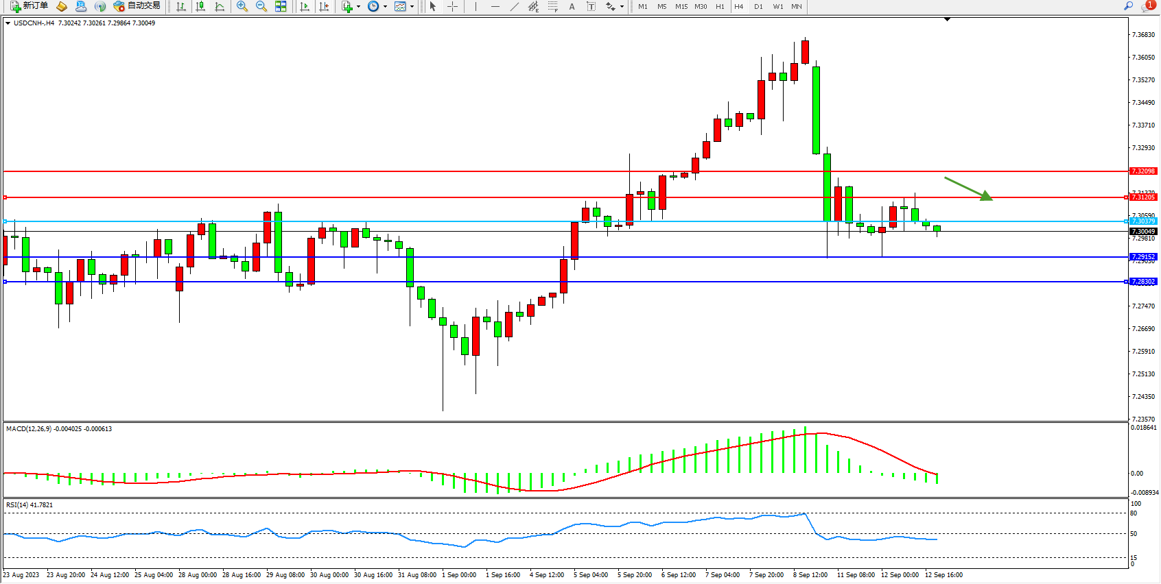 美元人民币USDCNH——4小时K线图显示:
