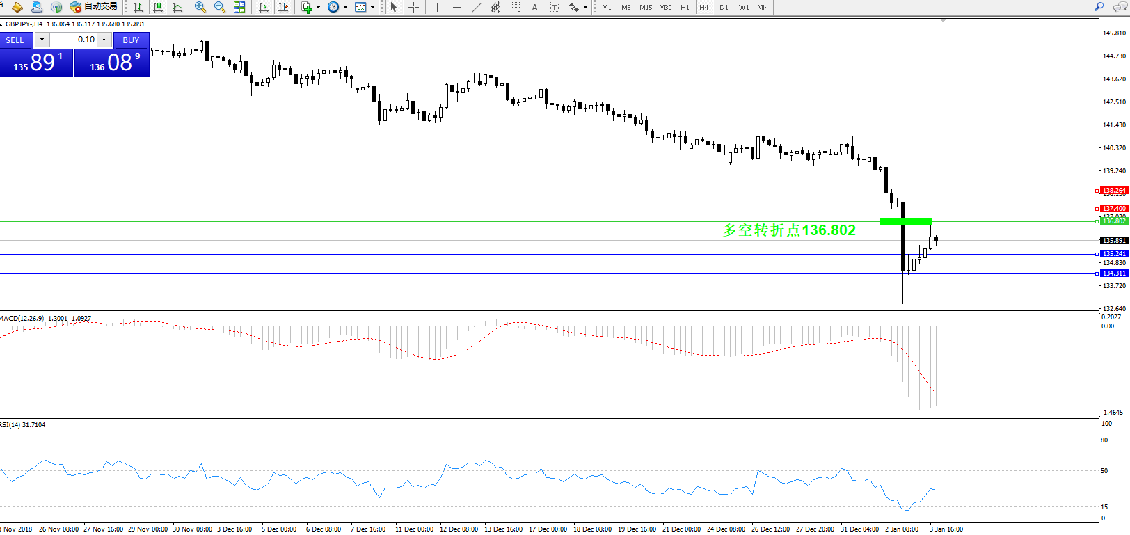 交易策略:136.802下方看跌,目标135.241134.311