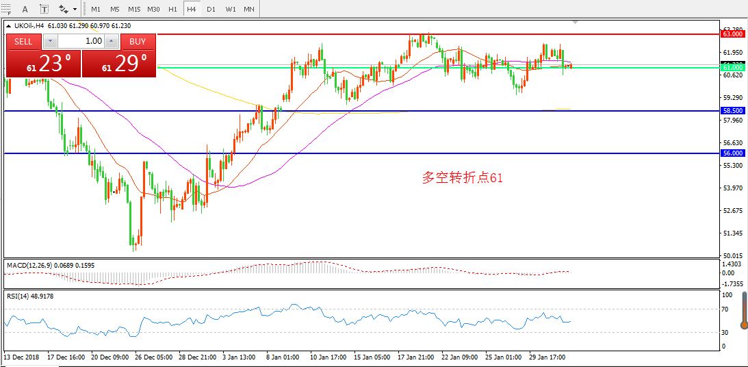 4小时图看,油价在61-63美元整理后, 昨日强势突破后中阴线回落,整体价格依然在支撑之上。均线系统逐渐走平, MACD红柱减少,预计区间震荡仍将继续。