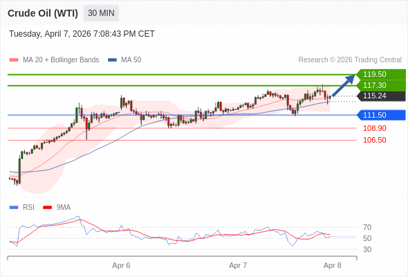 在 111.50 之上,看涨,目标价位为 117.30 ,然后为 119.50 。