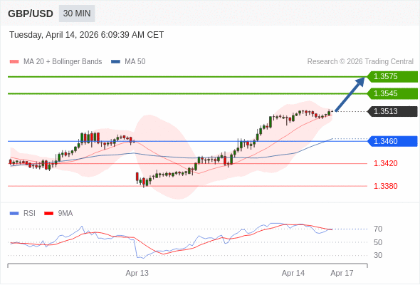 在 1.3460 之上,看涨,目标价位为 1.3545 ,然后为 1.3575 。