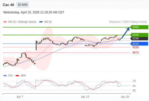 Cac 40 当日内: 超短线(当日内)支撑位在8210附近。