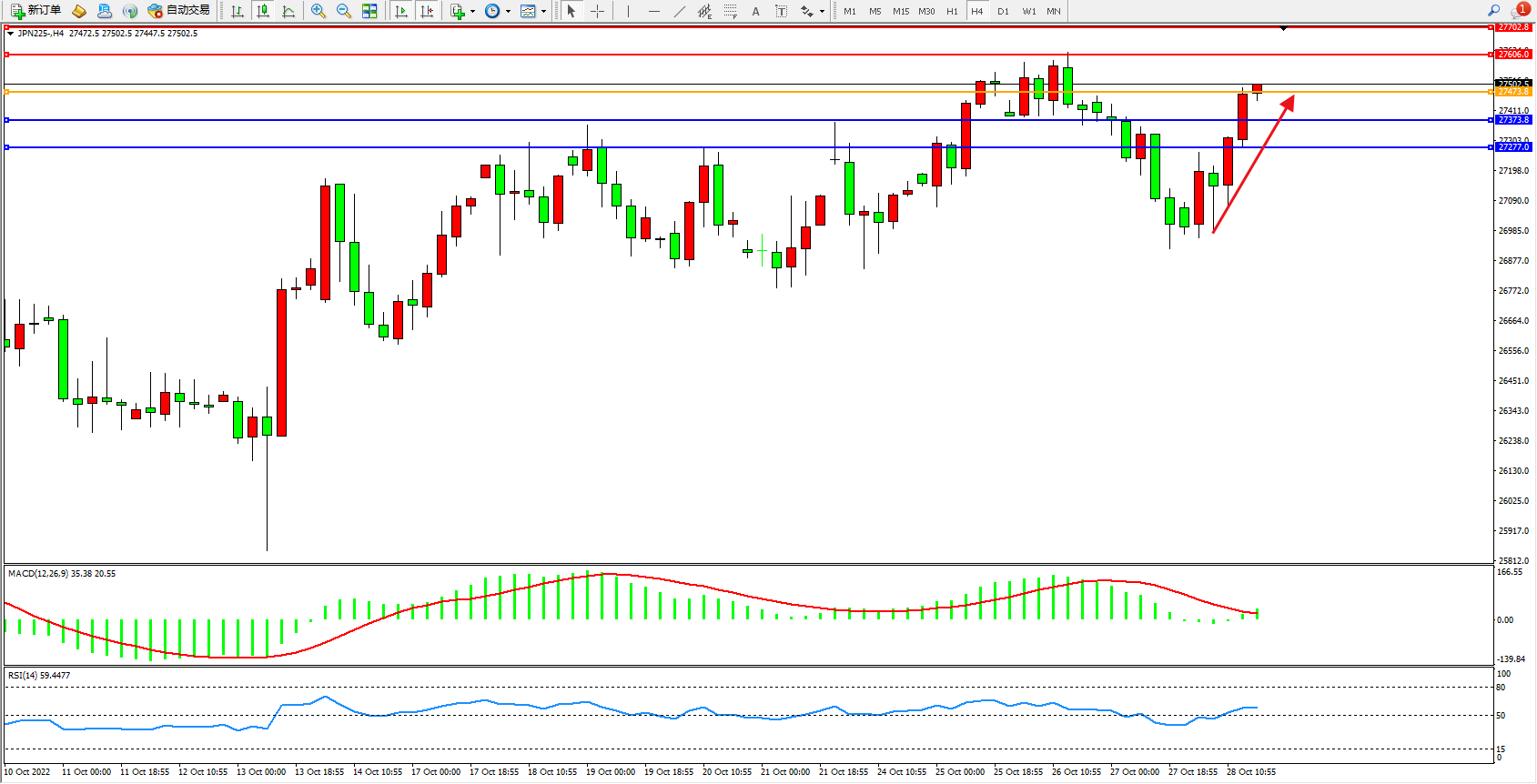 日经指数JPN225——4小时K线图显示: