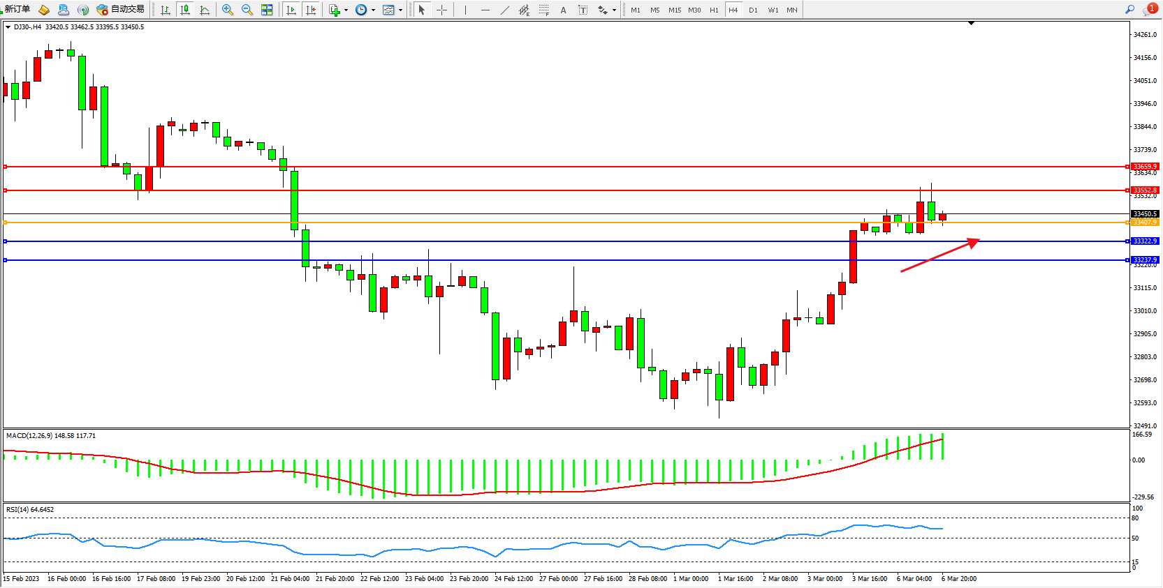 道琼斯指数DJ30——4小时K线图显示: