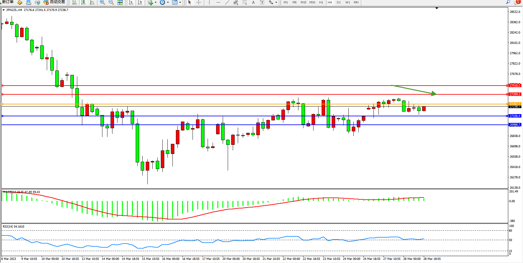 日经指数JPN225——4小时K线图显示: