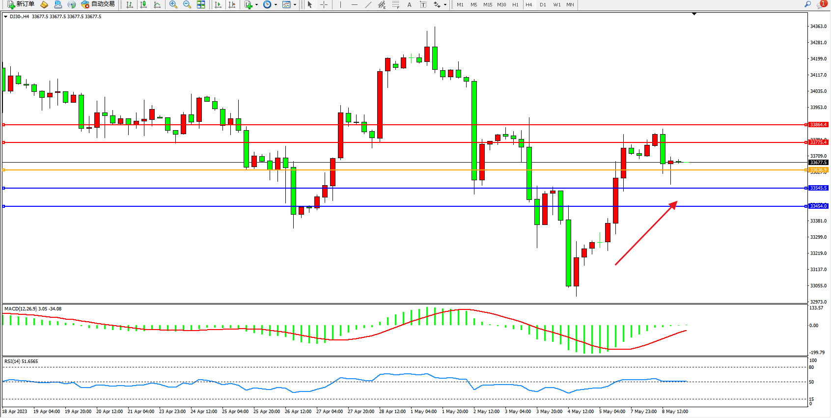 道琼斯指数DJ30——4小时K线图显示: