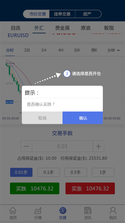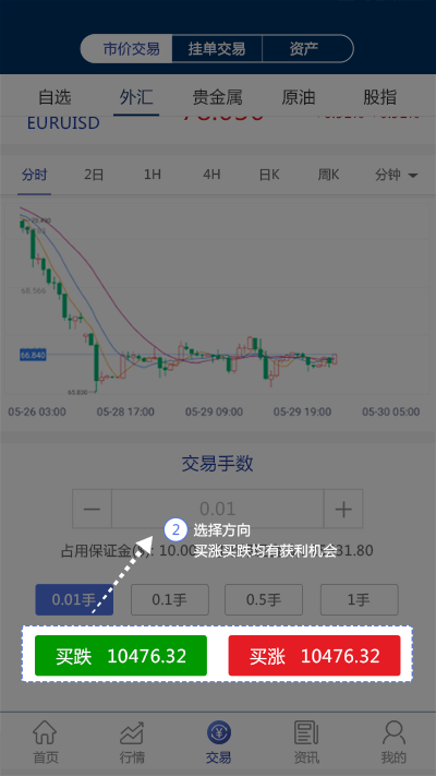 1.进入市价交易界面,输入或选择交易手数(最小可开仓0.01手,最大可开仓10手)