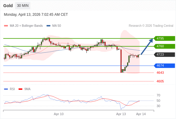 在 4674 之上,看涨,目标价位为 4760 ,然后为 4795 。